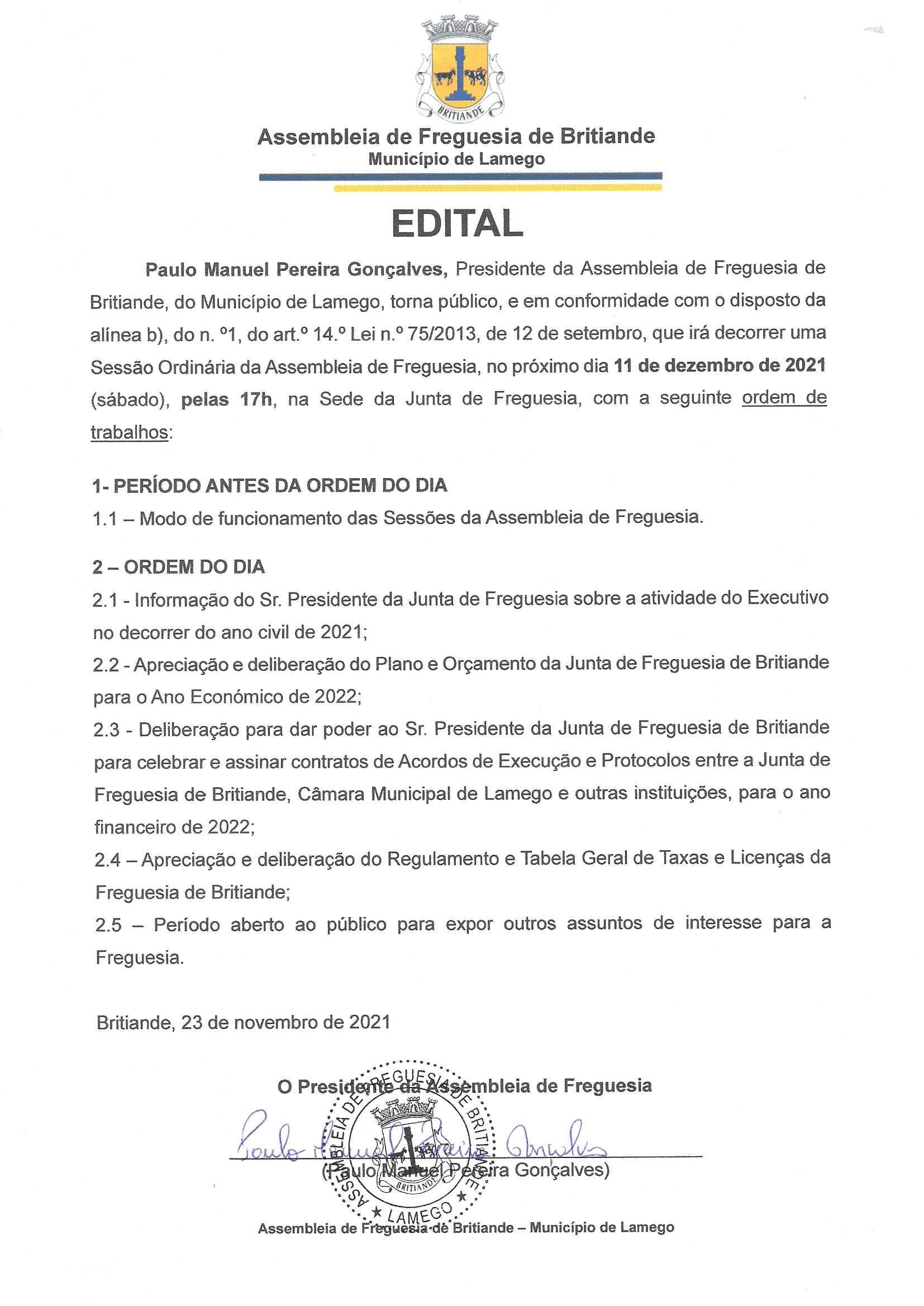 SESSÃO ORDINÁRIA DA ASSEMBLEIA DE FREGUESIA DE 11 DE DEZEMBRO DE 2021