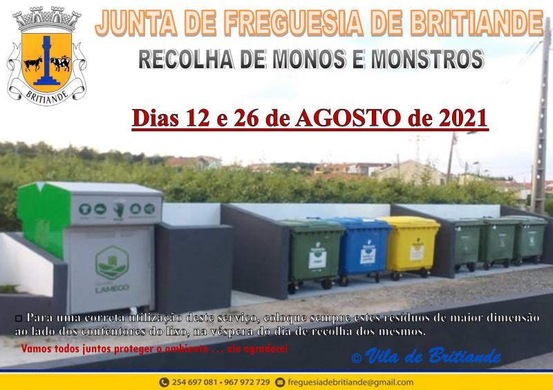 RECOLHA DE RESÍDUOS VOLUMOSOS (Monos/Monstros Domésticos) VILA DE BRITIANDE - dias 12 e 26 de AGOSTO de 2021